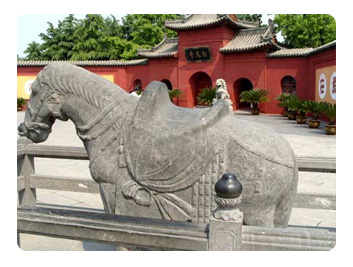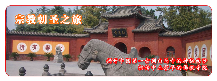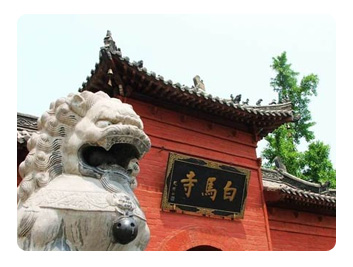 白马寺位于洛阳市东12公里,北依邙山,南近洛水,是中国佛教的发源地。创建于东汉永平十一年(68),迄今已历一千九百余年的岁月。据记载:东汉永平年间的一天夜里,汉明帝刘庄做了一个奇异的梦,梦见一位神异的金人。那金人身高六丈,背项发光,从空中飞行而来。明帝不知此梦是吉是凶,第二天便询问众臣。一位叫傅毅的大臣叩首答道:梦见的金人是天竺圣人。于是永平七年(64)汉明帝派遣蔡谙、秦景、王遵等十多人由洛阳出发,前往天竺国寻求佛法。这十多位西行求法者过天山、越葱岭,辗转来到今阿富汗一带的古大月氏国。在那里,他们巧遇印度高僧摄摩腾和竺法兰。乃同腾、兰以白马驮载佛经、佛像,于永平十年(67)返回中土。第二年汉明帝下令在洛阳城雍门(正西门)外,根据天竺佛寺式样,建造了中国第一座寺院。鉴于佛经佛像由白马驮载而来,遂以白马寺为名。