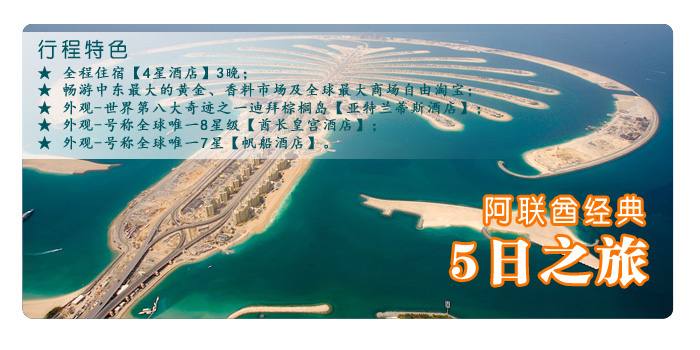 (车约2小时)--迪拜 早餐后,前往阿联酋首都--阿布扎比。参观酋长宫殿(外观);人工岛(外观),文化村,后参观扎伊德阿布扎比清真寺,该清真寺是目前规模位列世界第3的伊斯兰建筑的杰作,收藏有世界最大的波斯地毯。扎伊德阿布扎比清真寺是纪念七二年建立阿联酋后的第一任总统谢赫阿布扎比而兴建的。他曾经是阿布扎比酋长国的国王,05年去世。阿联酋正是在他领导下逐步发展到今天。整个清真寺耗资五十五亿美元。整个建筑群都用来自希腊的汉白玉包裹着,内部装饰金碧辉煌……女人进去必须换上黑袍披好黑纱才可以。来到这里忽然有一种净化心灵的感觉。返回迪拜,游览迪拜河。其有"海湾威尼斯"之称,一条宽阔的港湾向内地延伸约10公里,像一条水面宽阔的大河把这个城市分为两半,乘坐传统水上的士欣赏两岸的现代建筑物;随后往世界闻名的黄金市场以及香料市场,阿拉伯首饰以精美绝伦的做工、优惠的价格闻名,图案简洁色彩绚丽而又和谐。晚餐后,入住酒店休息。