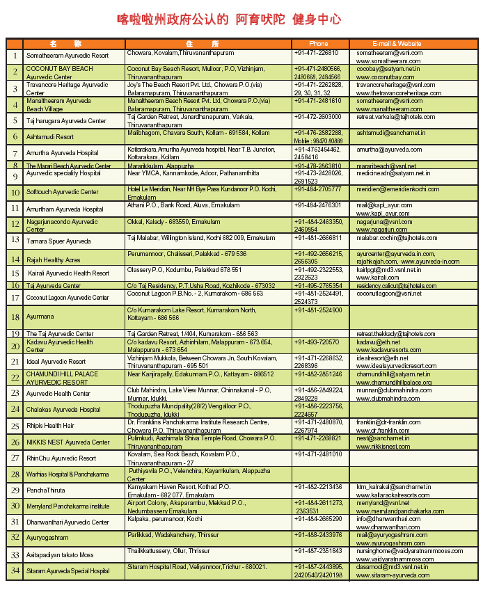 最后,水和土结合会形成叫做宾彖(Kapha)的要素。宾彖作为主管成长的要素,起到渐渐增加生物体组织的作用。除此之外,宾彖还具有保护功能。保护大脑和脊髓的脑脊髓液是存在于体内的一种宾彖,肠胃分泌的粘液还可以叫做具有保护生物体组织机能的宾彖。阿育吠陀医学提出人体由特定比例的瓦塔、皮塔、宾彖形成,这三种要素所占比例根据人会有所不同。这三种要素当中的某一种若占优势而失去平衡,那么阿育吠陀主张改变生活习惯或饮食,调节积累过多的要素。按摩疗法在长长的木腋上进行,由两位按摩治疗师同时进行按摩的精油按摩(Abhyanga)是指利用传统植物油的按摩。进行这种按摩可以达到排除体内排泄物等确实的疗效。皮吉其尔(Pizhichil)疗法对患风湿症和关节炎的人具有特效。体验一下将调味料继续涂抹于额头上的滴油疗法(Sirodhara)按摩吧!不仅身心会变得清爽,还可解除疲劳,再现活力。