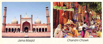 Chowk)是从莫卧儿王朝开始有的地摊街。通向寺院宽敞的道路中央有运河流过,如今这里因人力车、货马车、汽车等变得非常热闹。寺院周边地带狭窄的道路仿佛就像迷宫,这些道路被各种商店挤满,销售绫罗、合丝,银或珍珠、一切礼品的商店等。可以看到印度人在白色地毯上,喝茶聊天的样子。