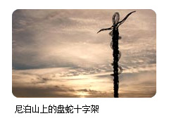 耸立在圣所外的盘蛇十字架象征着在沙漠引领摩西前进的铜蛇,以及耶稣被处决时所背负的十字架。