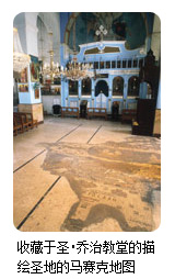 正真称得上马德巴的巨作,是藏于东正教圣o乔治教堂的,公元六世纪马赛克地图。该地图描绘了耶路撒冷和圣地,也是迄今为止,各种形式的圣地地图中最早的。